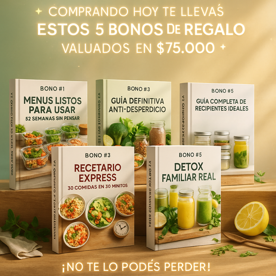 Olvidate de la improvisación: este bono te ofrece un año completo de menús semanales planificados, equilibrados y fáciles de preparar. Ideal para ahorrar tiempo y mantener la alimentación saludable de manera automática.